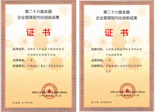 所屬江南造船(集團)有限責(zé)任公司申報的《老牌軍工企業(yè)基于模型定義的數(shù)字造船新模式構(gòu)建與實施》和中國船舶工業(yè)綜合技術(shù)經(jīng)濟研究院申報的《大型船企聚焦國際競爭的知識產(chǎn)權(quán)戰(zhàn)略管理》分獲國家級一等獎。本屆僅有30項一等獎,另有4項成果榮獲國家級二等獎,獲獎成果數(shù)量創(chuàng)船舶行業(yè)歷年最好成績。